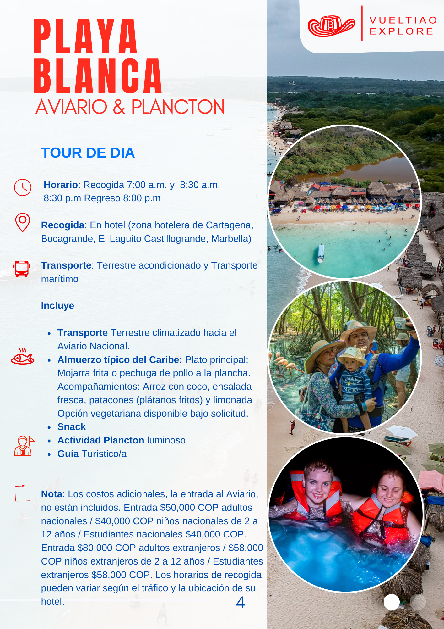Horario: Recogida desde 7:00 a.m. y  8:30 a.m. Regreso: 8:30 p.m