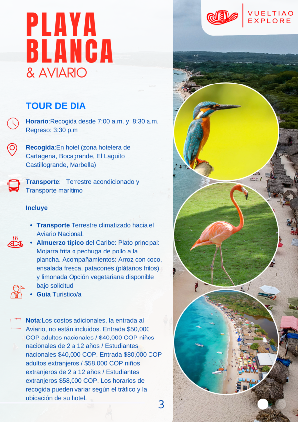 Nota:Los costos adicionales, la entrada al Aviario, no están incluidos. Entrada $50,000 COP adultos nacionales / $40,000 COP niños nacionales de 2 a 12 años / Estudiantes nacionales $40,000 COP. Entrada $80,000 COP adultos extranjeros / $58,000 COP niños extranjeros de 2 a 12 años / Estudiantes extranjeros $58,000 COP.