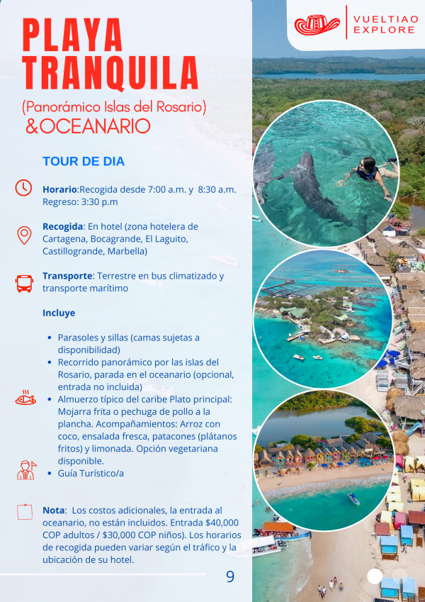 Nota: Los costos adicionales, la entrada al oceanario, no están incluidos. Entrada $40,000 COP adultos / $30,000 COP niños). Los horarios de recogida pueden variar según el tráfico y la ubicación de su hotel.