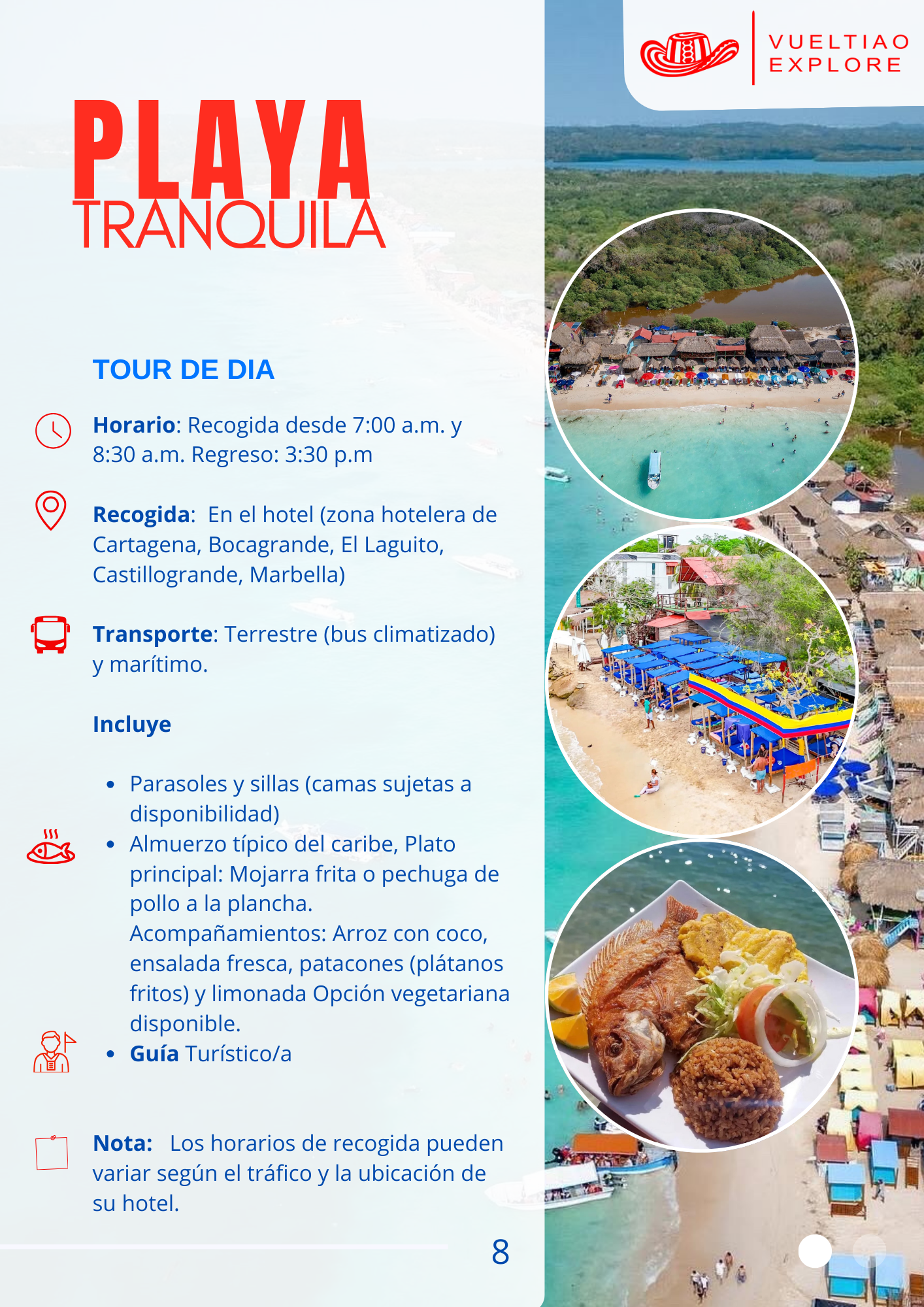 Recogida:  En el hotel (zona hotelera de Cartagena, Bocagrande, El Laguito, Castillogrande, Marbella)