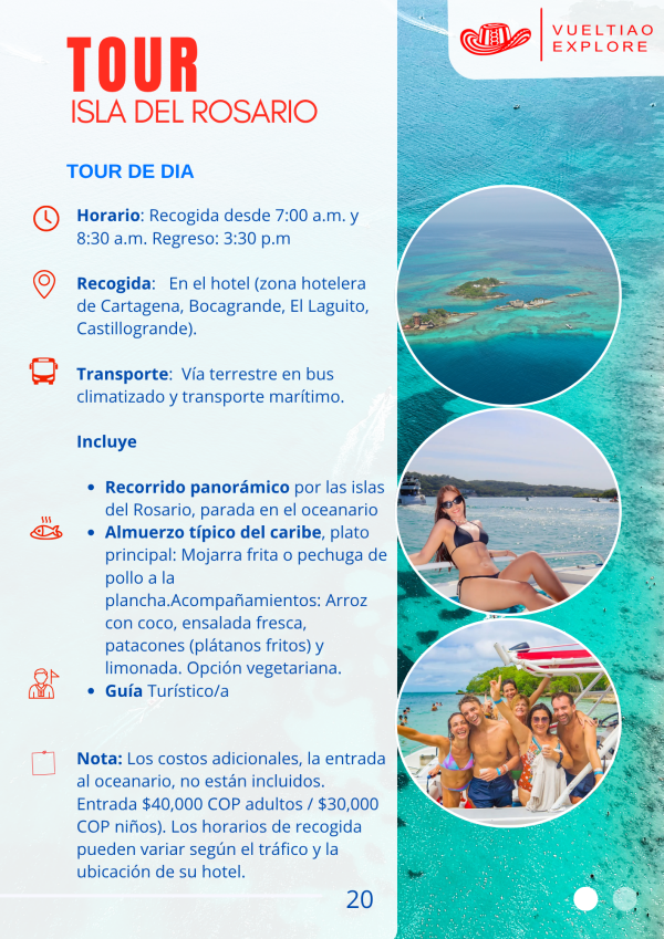 Nota: Los costos adicionales, la entrada al oceanario, no están incluidos. Entrada $40,000 COP adultos / $30,000 COP niños). Los horarios de recogida pueden variar según el tráfico y la ubicación de su hotel.